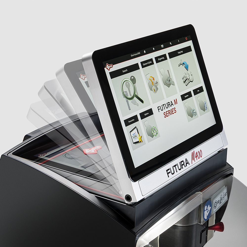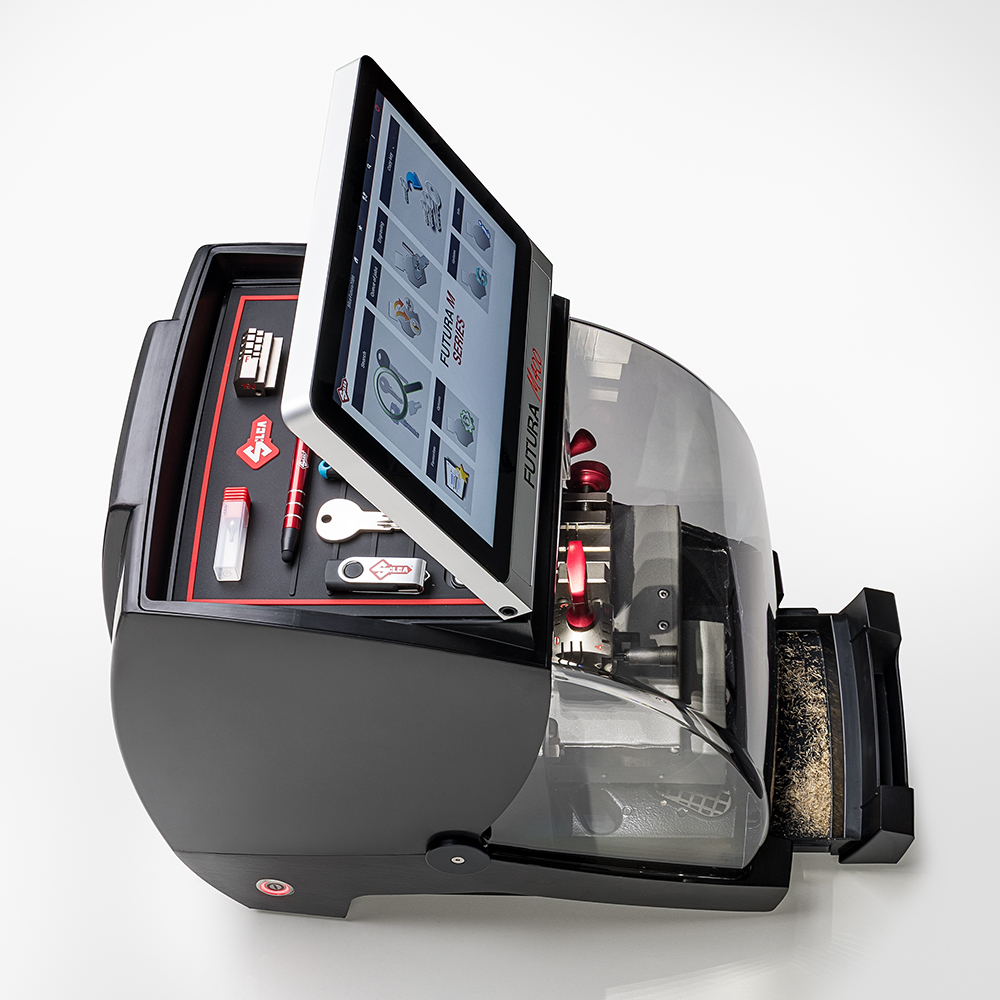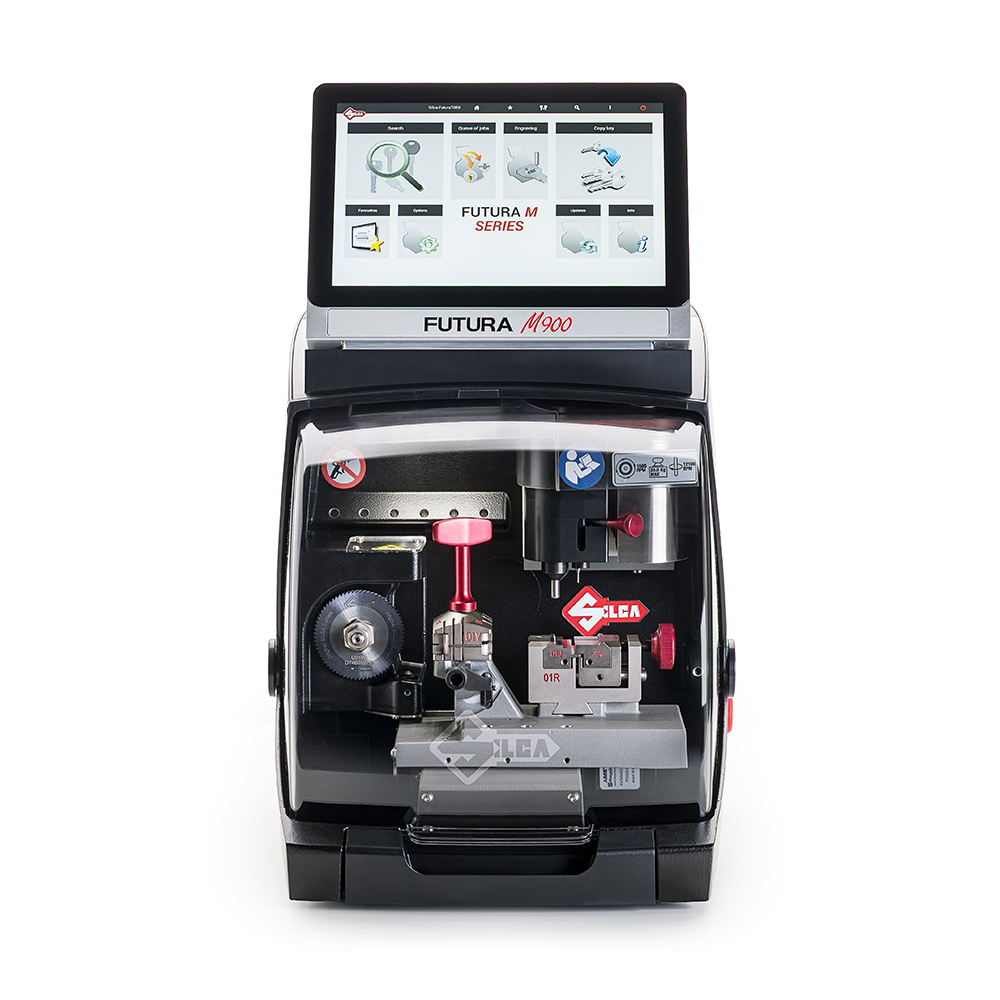 Silca’s iconic key cutting machine is now faster, quieter, and even easier to use. With its powerful and intuitive software and its ability to cut all types of keys, including protected systems and custom cylinders, the Futura M900 is the ideal all-in-one solution for professional key duplication. New with the Futura M are an integrated monitor always connected to the machine, a long-life WIDIA cutter, and a new motor driver for significantly quieter operation. Optimized engraving for a wide range of keys, medals, and nameplates.